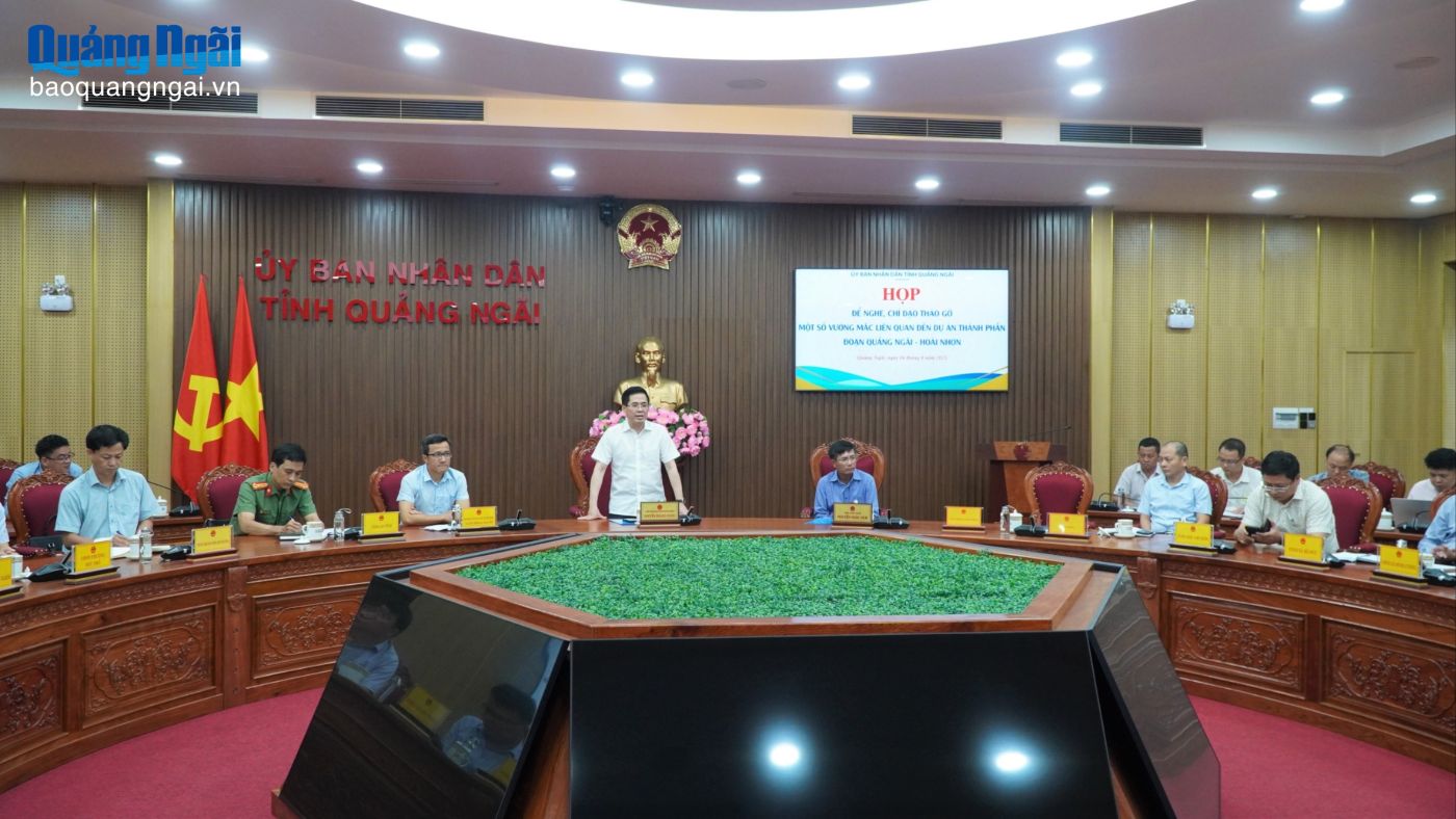 Sáng 6/8, Phó Bí thư Tỉnh ủy, Chủ tịch UBND tỉnh Nguyễn Hoàng Giang chủ trì buổi làm việc với các đơn vị, địa phương để chỉ đạo tháo gỡ một số vướng mắc liên quan đến dự án thành phần đoạn Quảng Ngãi – Hoài Nhơn thuộc dự án xây dựng đường cao tốc Bắc – Nam phía đông, giai đoạn 2021 – 2025. Tham gia buổi làm việc có Phó Chủ tịch UBND tỉnh Nguyễn Ngọc Sâm.