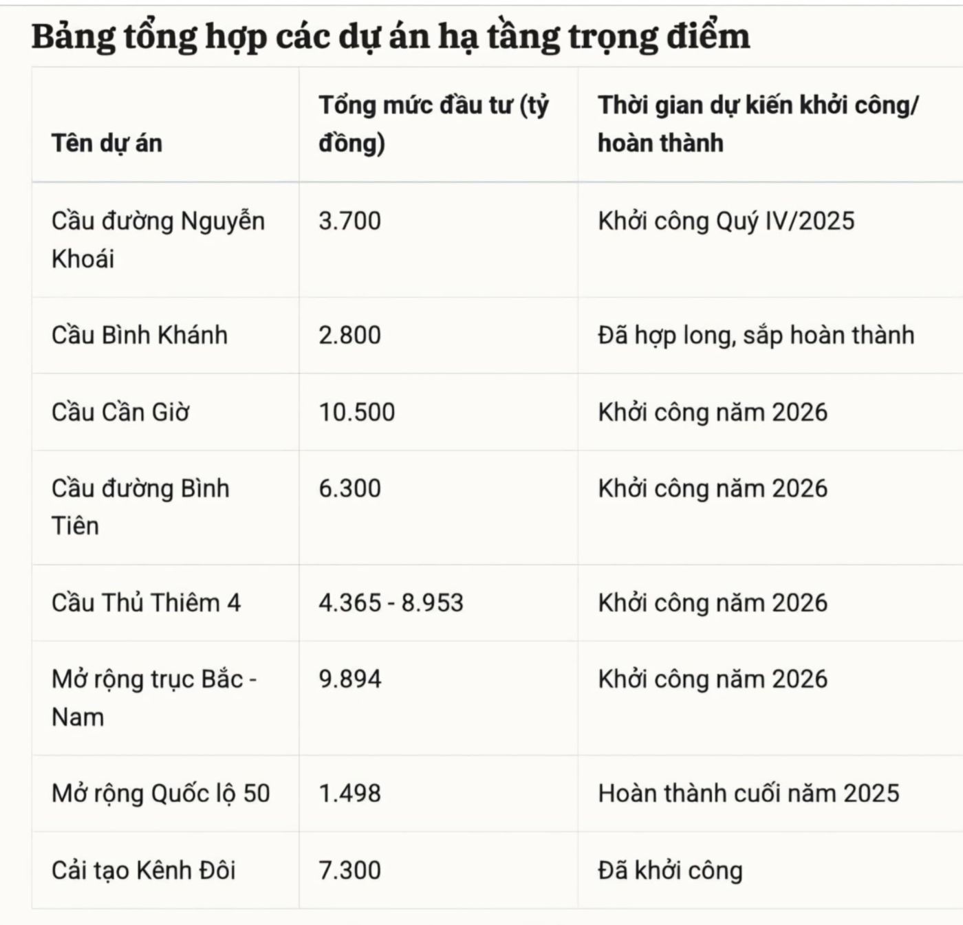 Lưu ý: Thông tin về tổng mức đầu tư và tiến độ các dự án có thể thay đổi theo các quyết định điều chỉnh quy hoạch và tình hình triển khai thực tế của cơ quan chức năng.